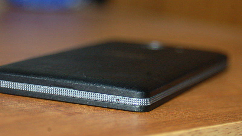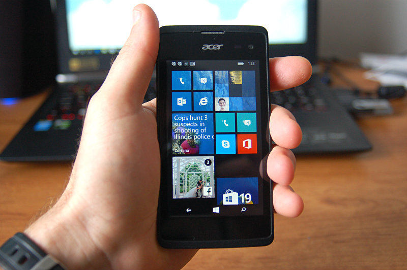 Acer’s entry level smartphone is a slim, lightweight design. The back plastic cover has a texture reminiscent of a thin carbon fiber weave. This works with the textured sides to create a more secure grip. The only buttons are power/wake up and volume adjustments on the right side of the unit. Everything else is controlled through the Windows 8.1 interface. The Micro USB and 3.5 mm input jack are found uncovered on the top.