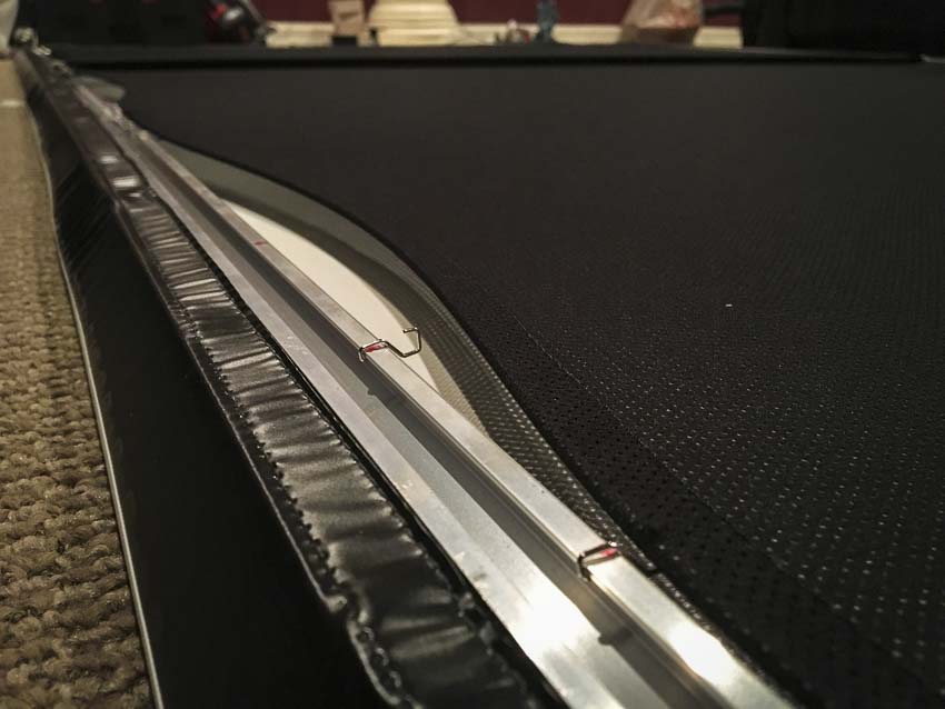 This size screen includes two center support bars for stability. Th proved perfect as it allowed me to avoid placing a support overtop my center channel speaker! With those in place, I mounted the black backing. Securing the backing involves placed the included custom metal clips around the perimeter of the aluminum screen frame. Then, you insert included plastic rods around the edges of the backing to stiffen the perimeter. This lets you secure the material to the frame without tearing it.