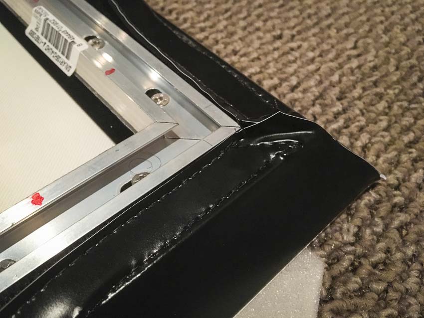I assembled the screen frame using the supplied elbow and center joints. The pre-threaded holes made for easy line-up and fastening. I then stretched the material across it, being careful to extend the screen material all the way to the edges and corners. This proved difficult. In the end, however, I got it accomplished. I pulled it at least far enough to be covered up by the 1/2-inch metal trim. Had I wanted, I could have finagled it further to achieve a truly seamless edge all around. The back side of the screen material actually has hook and loop borders all around the edges which attach to the frame.
