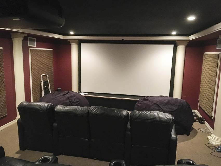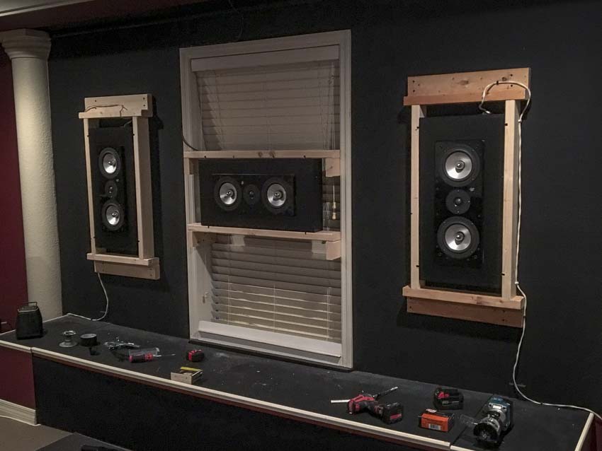Full disclosure: We moved into a home with an existing home theater room—I know, lucky us! This particular home theater originally used floorstanding speakers and a 120″ pull-down screen positioned between. Because I wanted to use my RBH Sound Signature in-walls—and because the new screen could support it—I opted to construct custom frames to hold them on the wall. This allowed me to mount them behind the Elite Aeon AUHD 135″ projector screen. Incidentally, this is how movie theaters position their speakers—behind the screen. It absolutely delivers the best listening experience possible. It also gave me an additional 15″ of diagonal screen real-estate PLUS another 4″ diagonal by using the thin 1/2-inch bezel. A traditional screen would have a thicker 2.5-inch border or similar. Altogether, I pulled off a 7.2 surround system and two rows of home theater seating in a 16 ft. x 22 ft. room.