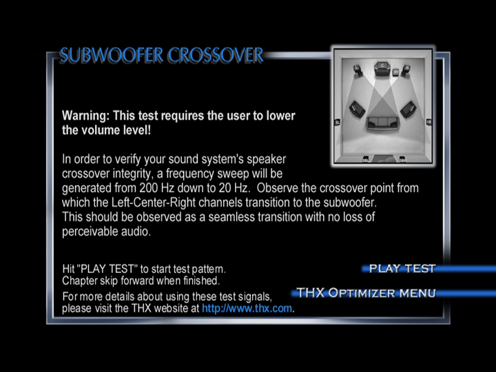 You can find sweep tones like this on any THX-certified movie. Just look for the THX logo on the front, pop the movie in, and look for the THX Optimizer app in the Extras of the menu system. If there is a huge dropout in frequencies when you run this test, then you may have to either change the crossover frequency so that it’s higher. You may even have to move your sub around a bit. This can help you see if it changes the acoustical effects on the low frequencies.