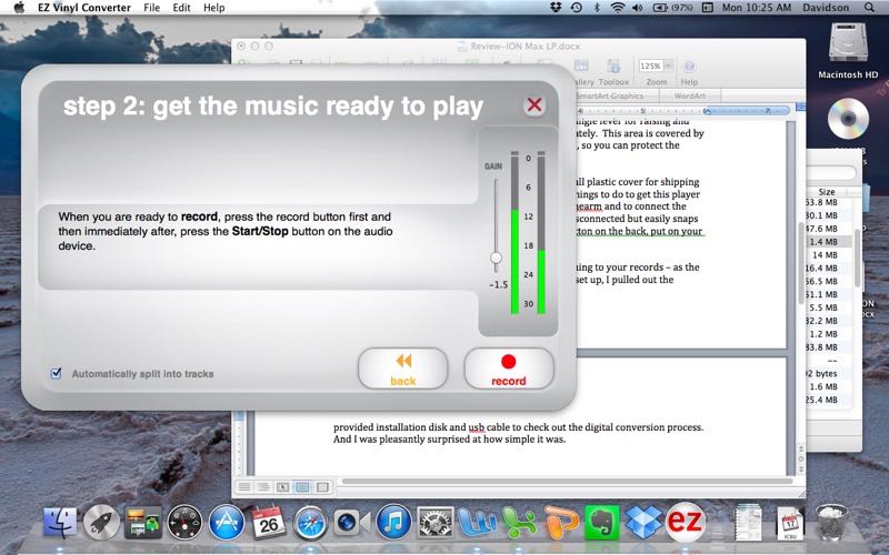 The first step asks you which audio source your using. The second step provides you with your first look at whether you have everything set up correctly. On this screen, a digital meter tells you whether the computer is hearing your record. You can start playing the record and adjust the gain/input level to make sure your tracks sound good. You can also choose to manually determine the split between tracks or let the software do it for you. Once you’ve done that you’re ready to record.