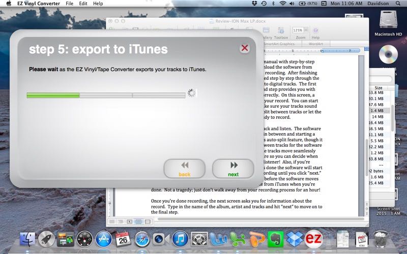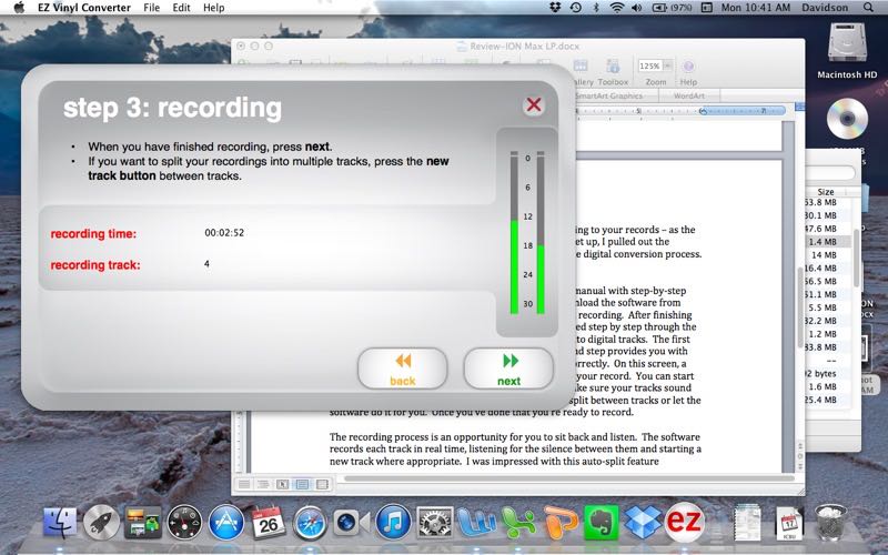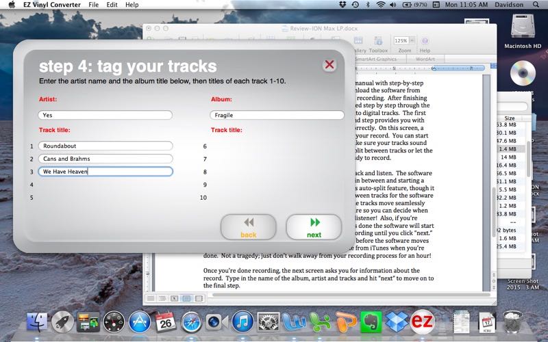 Once you’re done recording, the next screen asks you for information about the record. Type in the name of the album, artist, and tracks, and hit “next” to move on to the final step. The software takes over from here, opening iTunes automatically and converting the files to the appropriate format for your iTunes configuration. Moments later it will ask you if you’re done recording. If not, you can start the process over. If you are finished, you just click “No” and then “Next”, and you’re ready to enjoy your tracks in iTunes.