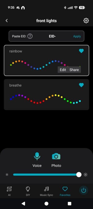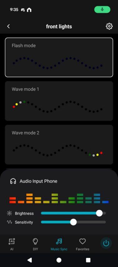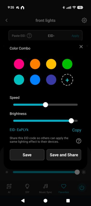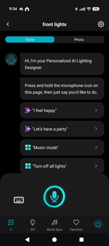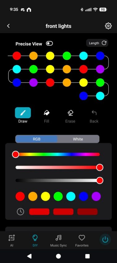 The rest of the controls are only accessible when the lights are on (not sure why this is the case). There is the DIY screen where you can directly control the lights, the Music Sync screen for having your lights pulsate to your music (not something I’m interested in so I didn’t play with it much), and a favorites screen. Anything you set in your DIY screen (or via the AI) can be saved to your favorites. The DIY screen, for the most part, is where the real magic happens. It’s also the most confusing part of the whole experience.