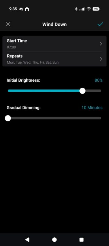 The Lepro E1 lights are controlled by the Lepro app. I’m a big believer that apps should, at their heart, be somewhat intuitive. You can make that argument for the Lepro app. I wouldn’t, but you could. The landing page is the “AI” interface. Here, you ask the AI to make changes to your lights. From what I could tell, it will set up color combinations for you (Christmas colors or rainbow for example). It will not set start and stop times for you. To access start and stop times, you’ll need to press the “cog” button on the top right which will include “wake up” and “wind down” controls. These controls include a brightness setting (not sure why you need this for the wind down) and gradual dimming. Gradual dimming can be set between 10 and 30 minutes on a slider. If these controls sound confusing, I agree.