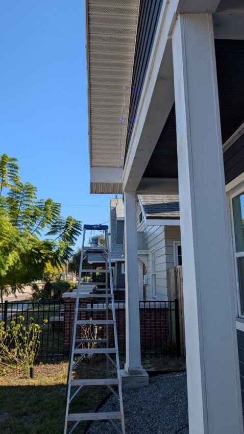 Step one for attaching is to clean the surface. A dirty surface (either wood or plastic) pretty much ensures that the adhesive will fail. Since I have about a million disinfectant wipes left over from 2020, I used those to clean any spot I was going to attach a light. Rather than measure out so that I had the perfect number of lights, I just (mostly) stretched the cable as far as it would go and used that as my measurement. In a few spots, I needed to shorten the distance slightly because of rounding a corner or because of the plastic soffit. Also, rather than use some sort of guide to keep the distance from the home perfectly uniform, I just eyeballed it. I live in Florida, and it was kinda miserable outside, so I wasn’t feeling too motivated to stay out there any longer than I had to.