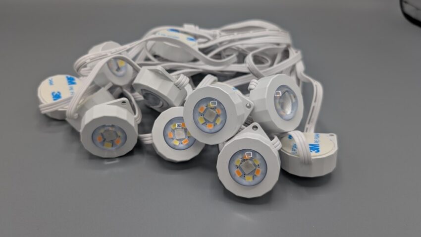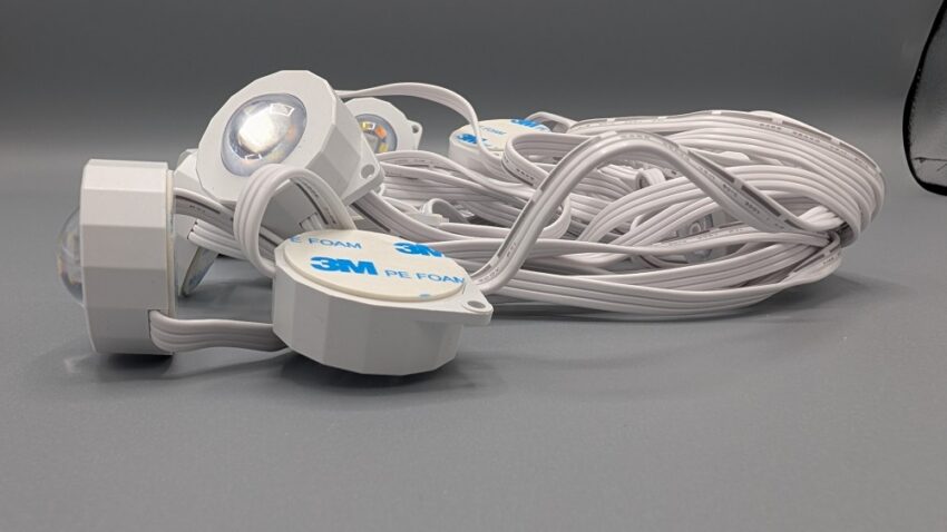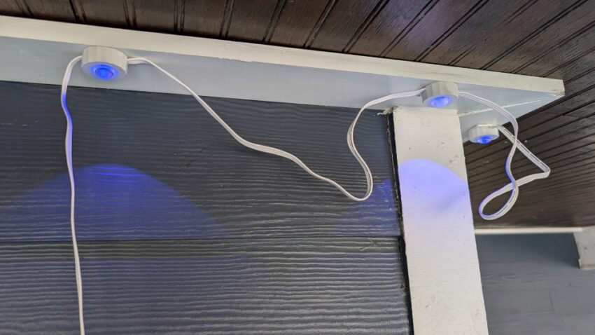 The lights are small and light with a 3M adhesive backing that can be used to stick the lights under your eaves. They also include screws and drywall anchors if the adhesive isn’t working for you. If one of the adhesives fails to stick (more on that in a bit), there are additional double-sided pieces you can use to replace them.