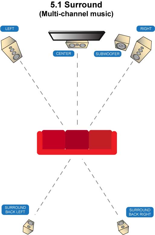 For multi-channel music you keep almost the same configuration as the 5.1 surround layout above, however you want speakers that are not diffuse. These can be two-way bookshelf speakers, or even another matched pair of tower speakers. These surrounds will be separated by at least 60 degrees or more and angled inward towards the center listening seat.