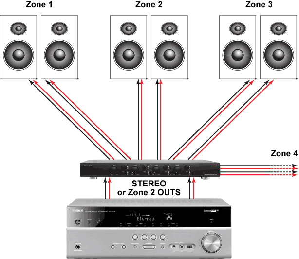 Hooking up a speaker selector switch to your system is child’s play as you can see in the diagram below. All you do is feed it a powered output and then choose which zones to send your audio to. In this first diagram, we show a simplistic speaker selector configuration with integrated volume controls: