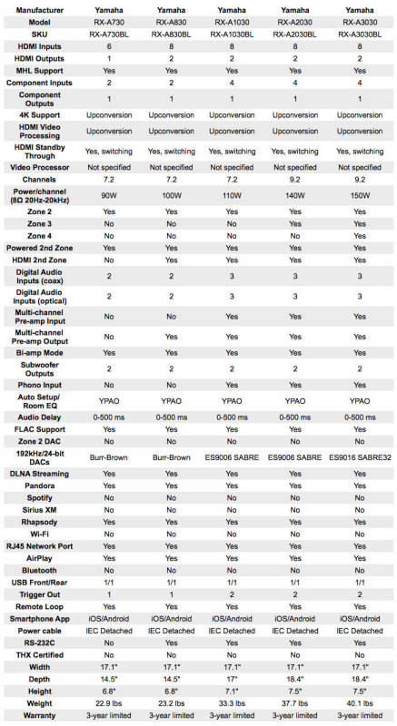 Shopping for the perfect A/V receiver can be tough, but it’s good to know that you can bring up a chart that compares the various features of receiver models against each other on Audiogurus.com. When you’re already convinced of what brand you’re going to buy, and you just want to know a little more about how each model differs, then those huge comparisons might be a bit much. For the discerning shopper, we’ve generated these convenient Step Chart Guides to help advise you when making a purchasing decision. With these step charts, and our accompanying comments, you can should be able to understand the important breakpoints between Yamaha’s vast array of products and models. While feature differences abound from one models to the next—not all features are the same in terms of significance or importance. Some features are going to matter a lot, while others represent mere bumps along the path to a larger, more powerful model.